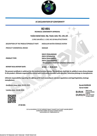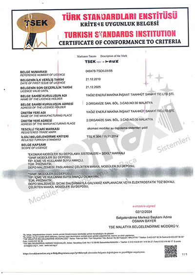Krom ve Galvaniz Su Deposu - TSE Belgesi